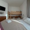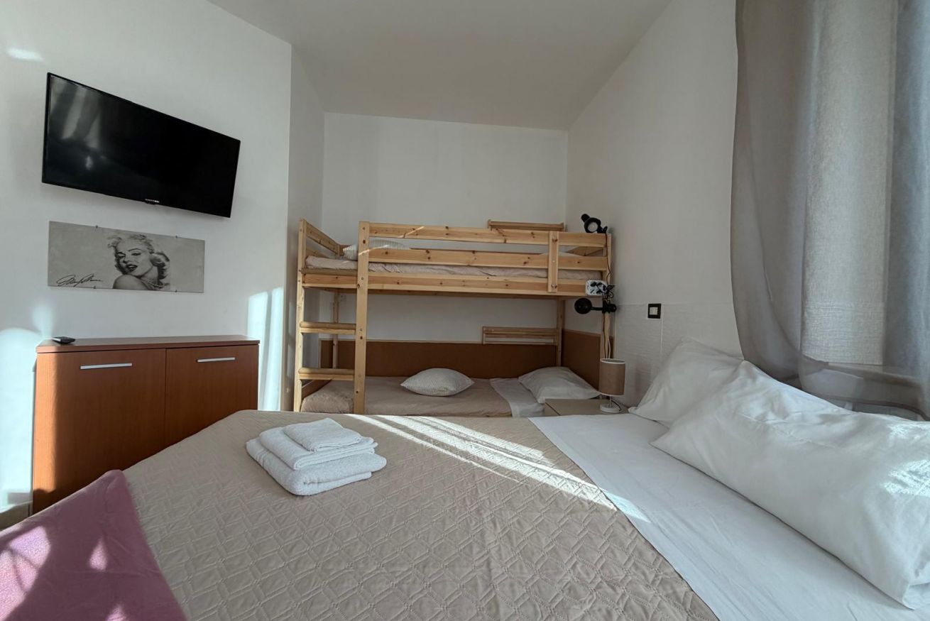 La camera ha un letto matrimoniale e un letto a castello molto comodo per una famiglia o gruppo di 4 persone. La camera ha una smart-tv e un armadio.