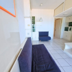 L'appartamento al piano quinto con ascensore, dispone di un ingresso sul salone con due divani letto, un tavolo da pranzo che affaccia sulla terrazza, attrezzata con tavolo e sedie. La cucina è completa di accessori per cucinare e macchina del caffè.