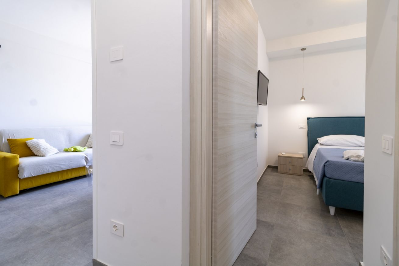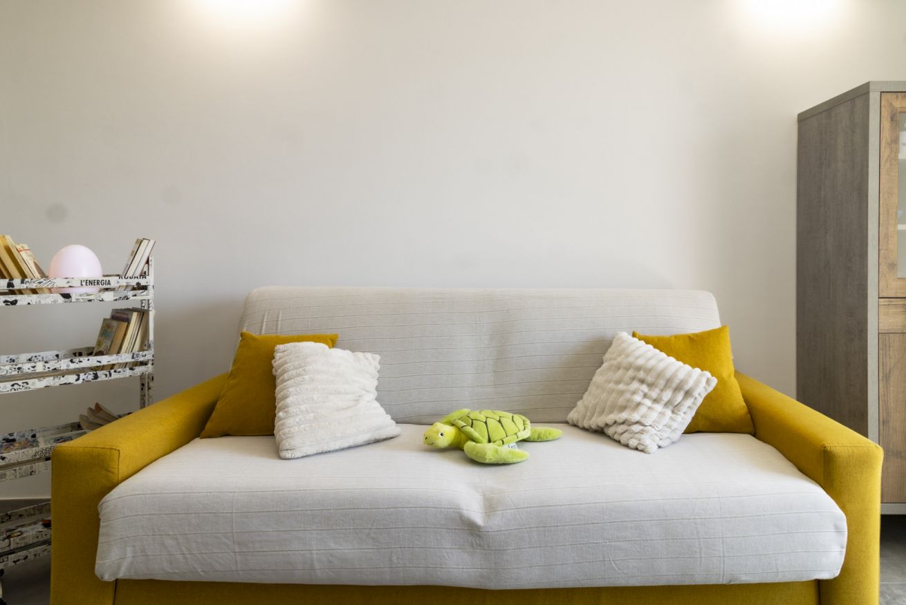 Nel soggiorno è presente un divano letto comodo, adatto anche per dormire, che rende l’appartamento perfetto sia per coppie sia per piccoli gruppi o famiglie.