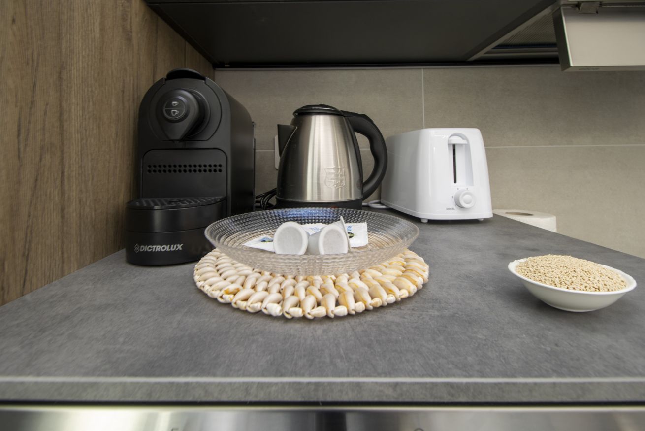 La cucina è dotata di sistema di depurazione dell’acqua, che rende l’acqua potabile direttamente dal rubinetto, ed è presente anche un gasatore per avere acqua frizzante.