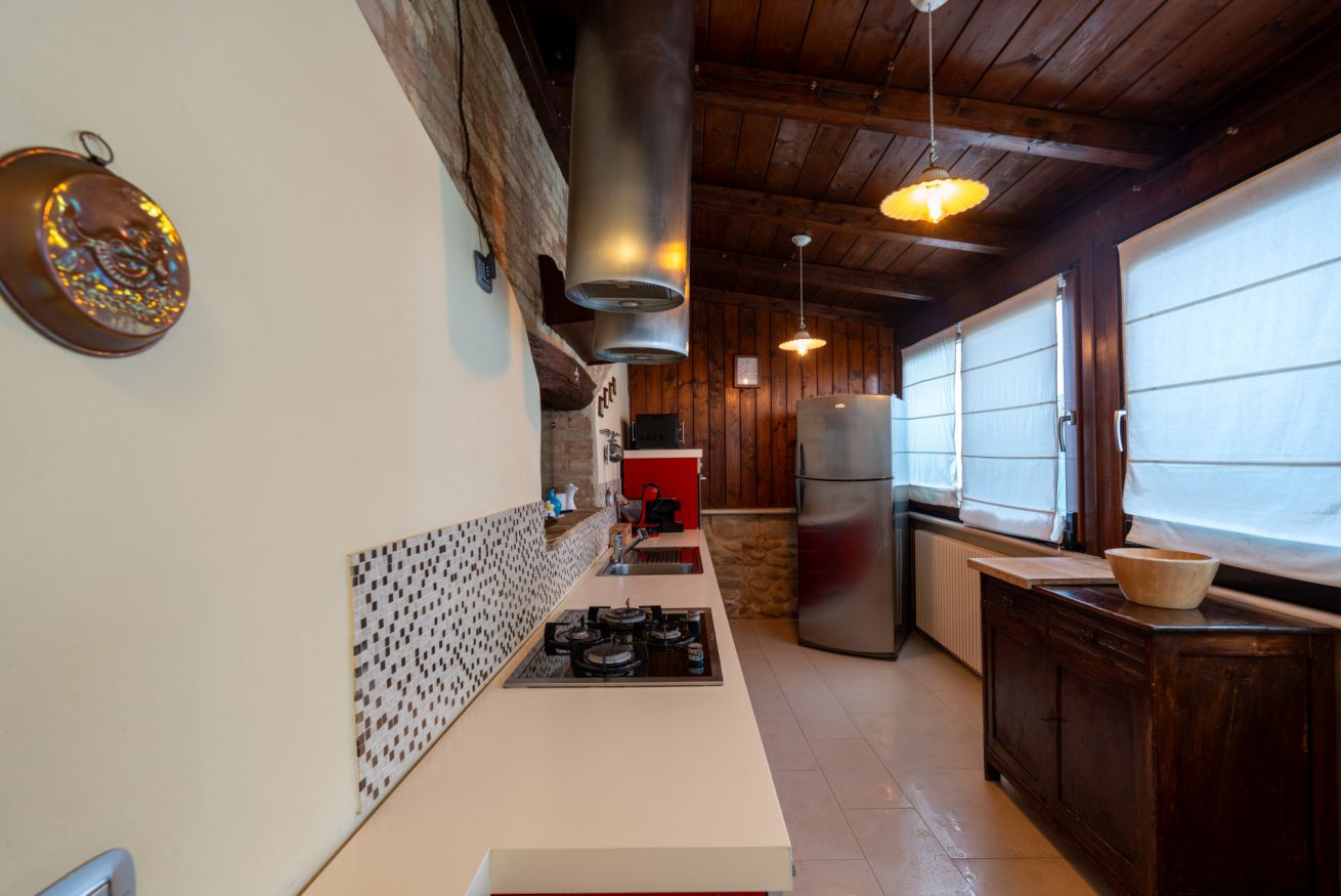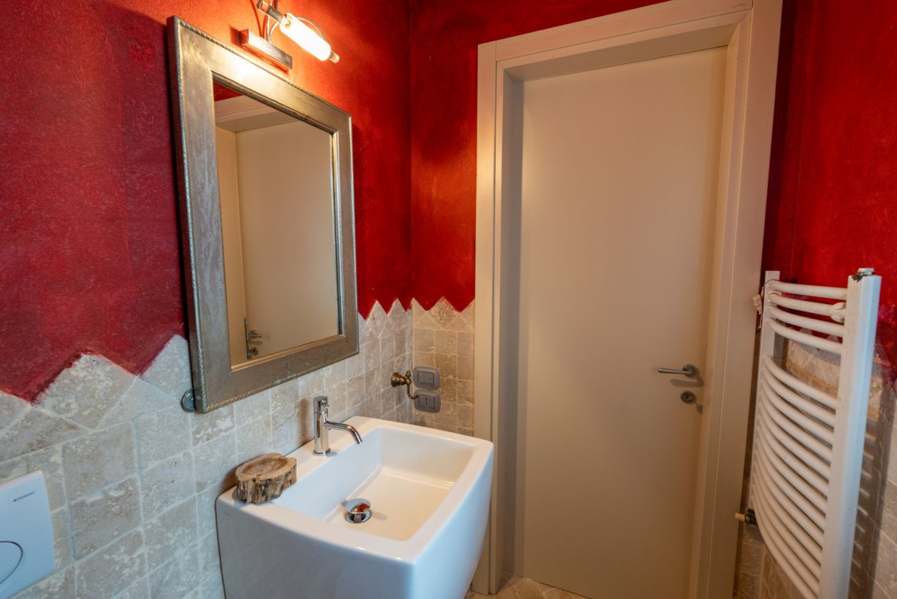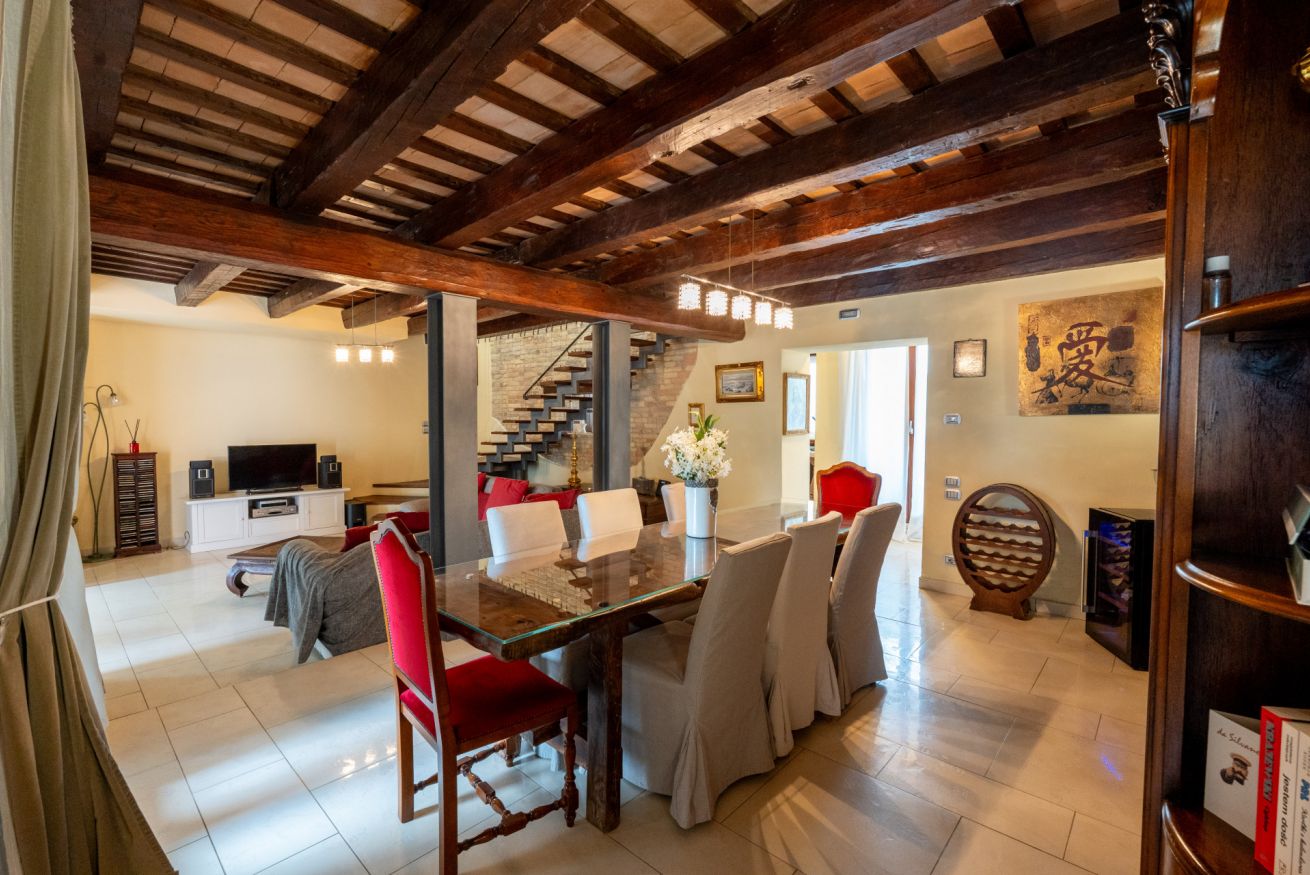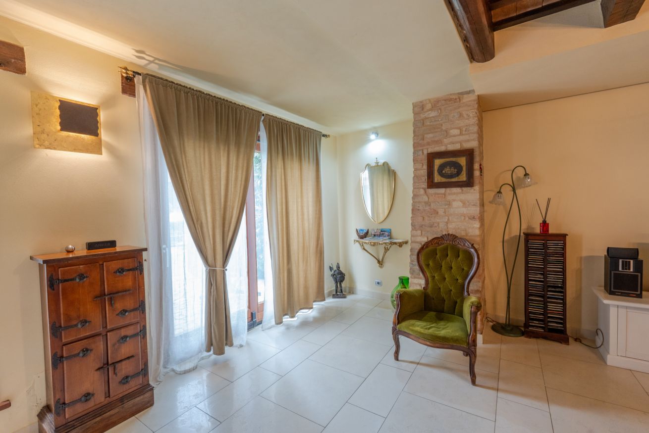La proprietà si sviluppa su due piani: al piano terra entrando dal lato giardino, si accede ad un salotto con angolo tv e zona con tavolo da thè. Attraversando la stanza si accede ad un open space che ospita la sala da pranzo. Proseguendo si accede ad una cucina classica con ampi piani e corredata di tutti gli accessori. Uscendo dalla cucina a sinistra si accede a un ripostiglio con lavatrice. Al piano terra è posizionato un bagno di servizio. Salendo al primo piano attraverso una scala a sbalzo in legno, si accede alla zona notte dove troviamo una camera doppia, un bagno con vasca idromassaggio e doccia e la camera padronale con letto matrimoniale vista piscina.